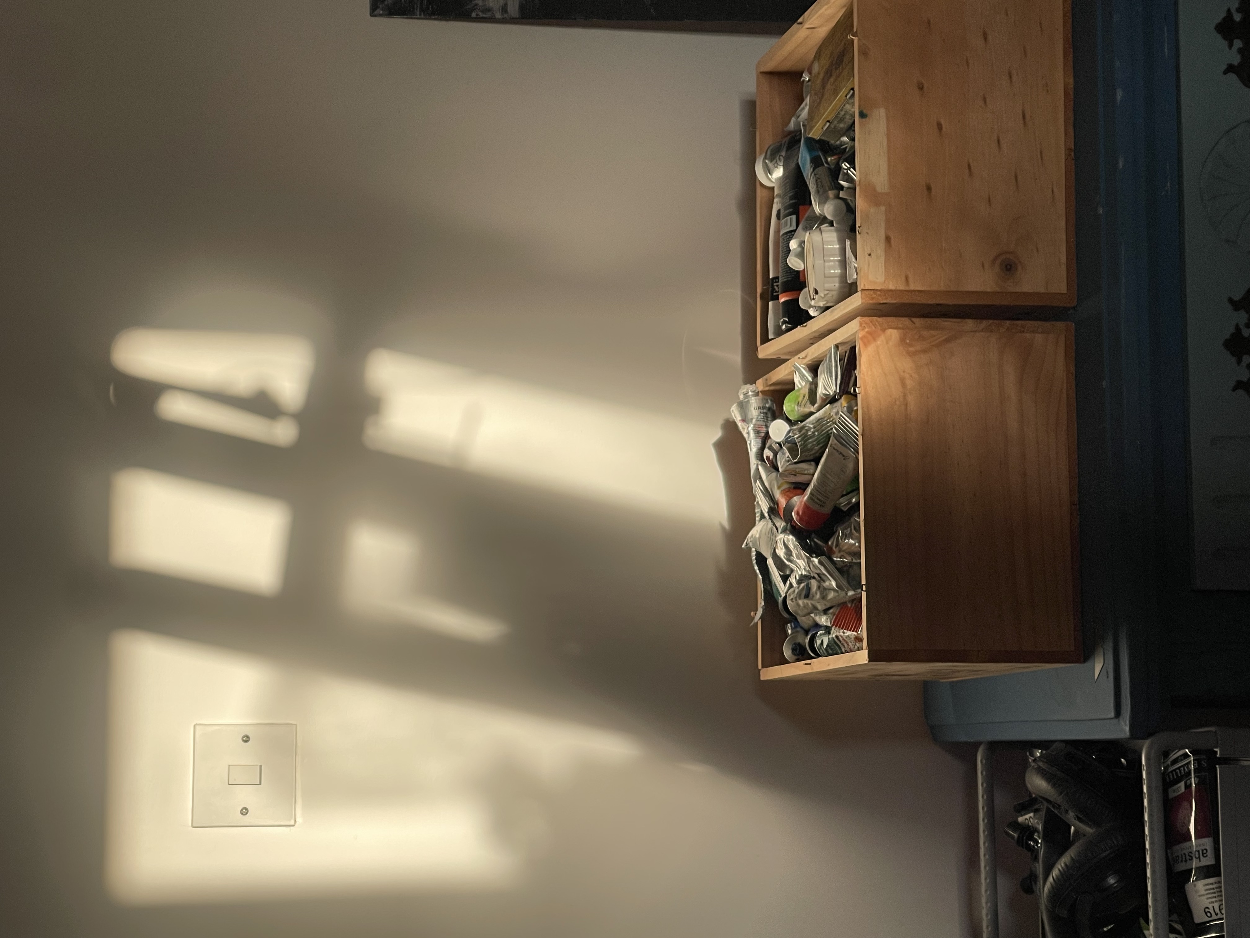 There was a moment the other day when the sun hit the wall just right, casting the faintest echo of the window across the paint boxes — as if the room was sketching itself. Little scenes like this have become their own quiet conversations.
